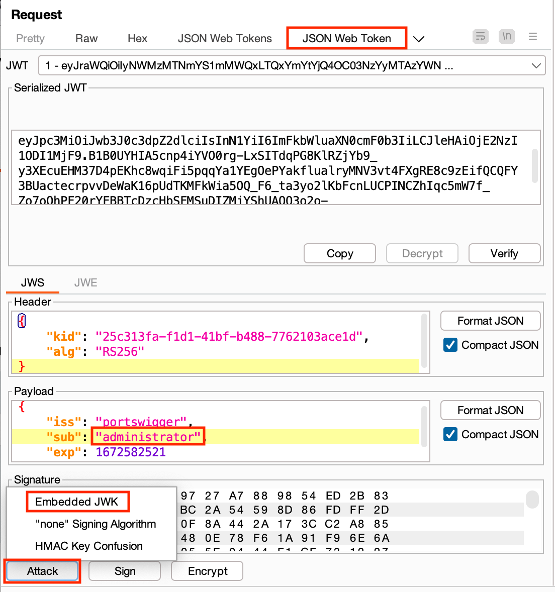 「JSON Web Token」タブで、「sub」クレームを「wiener」から「administrator」に改変し、「Attack」をクリックします。