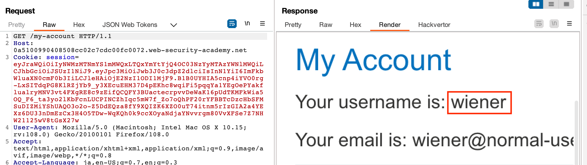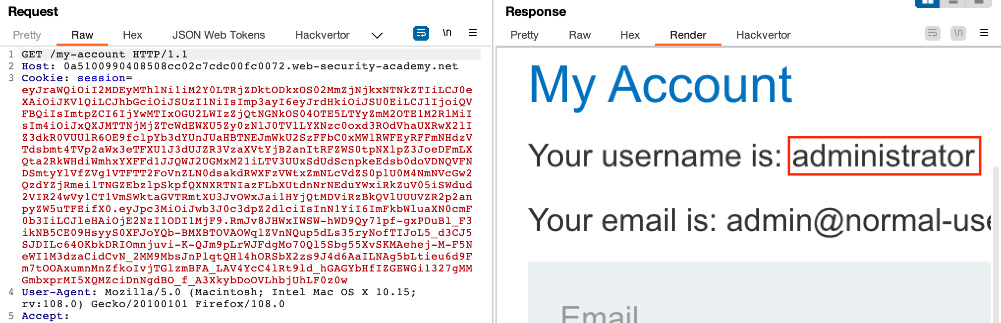 リクエストを送信すると、改変したJWTが正常に使え、レスポンスにユーザ「administrator」のMy Accout画面が表示されました。
