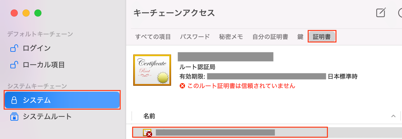 左メニュー「システムキーチェーン:システム」、上メニュー「証明書」を選択し、対象の証明書を選択します。