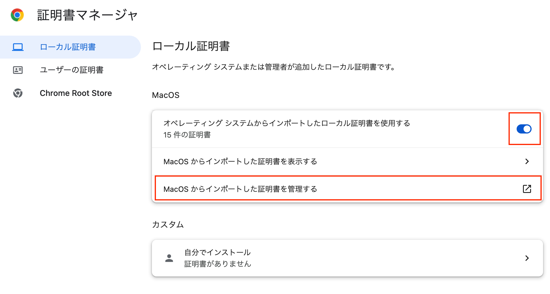「chrome://certificate-manager」へアクセスし、「オペレーティングシステムからインポートしたローカル証明書を使用する」が有効になっていることを確認します。