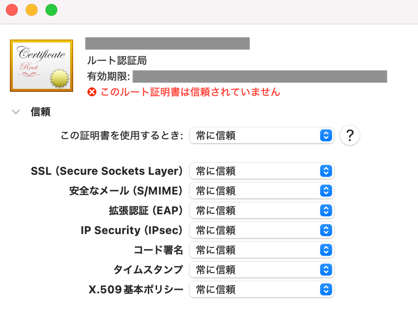 信頼設定を「常に信頼」に変更します。画面を閉じる際にパスワード認証することで、 信頼設定が保存されて証明書が機能するようになります。
